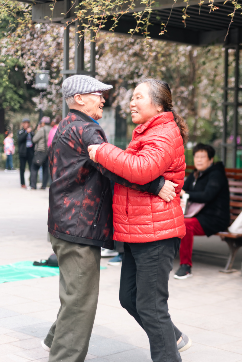 春日,两位老人在上海鲁迅公园快乐舞动,他们脸上的笑容感染了在旁的观众。